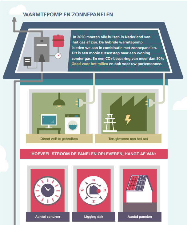 Tot nu toe bieden we een warmtepomp alleen aan samen met zonnepanelen. Die moet je al hebben of hiervoor in aanmerking komen. Kom je in aanmerking, dan krijg je van ons een brief. Zonnepanelen wekken gratis elektriciteit op die de warmtepomp weer gebruikt. Zo verwarm je dus deels gratis je huis. Al hangt de besparing op je energierekening af van veel zaken, zoals het weer, je energiecontract, de temperatuur in huis en je verbruik.