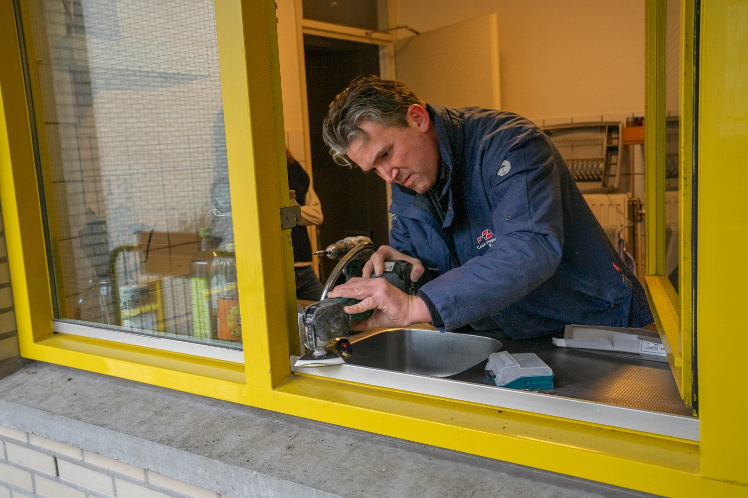 We komen aan bij het studentenhuis. Een studente leidt ons naar het raam in de keuken. Ide kijkt waar het raam klemt en wat de oorzaak is. Ook nu begint hij bij de scharnieren. Maar het rechttrekken daarvan is niet genoeg. Aan de onderkant schuurt hij het raam steeds een beetje bij. Hierna is het klemmen verholpen. Het ligt dus niet aan de tochtstrips, maar die vervangt hij wel. Zo sluit het raam nog beter.