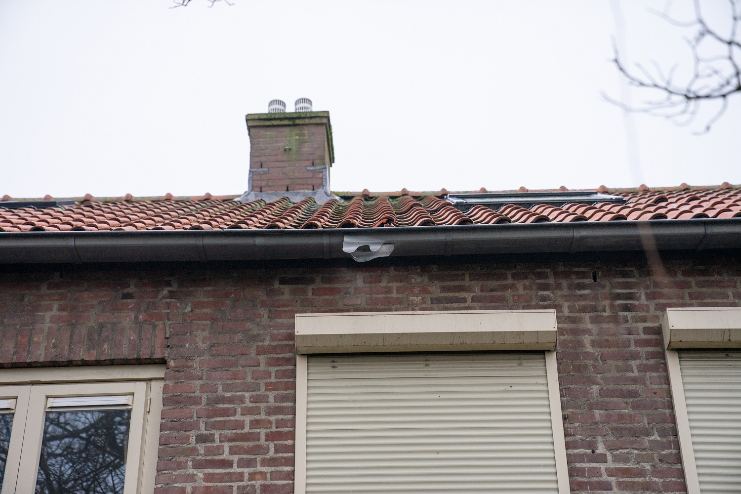 We rijden daarna naar een huis waarvan de dakgoot kapot is. De melding is net na oud en nieuw gedaan. Een vuurpijl zou in de dakgoot ontploft zijn en een gat hebben gemaakt. Daardoor lekt water naar beneden. Als we aankomen, blijkt er inderdaad een groot gat te zitten. "Dat is groter dan ik kan maken", zegt Ide. "En het zit ook te hoog. Dit moet een loodgieter doen, op een steiger." Ide zet dit meteen in de melding en informeert de bewoner. "Ik heb er gelukkig weinig last van, omdat het buiten is", zegt de bewoner. "Maar wel fijn als het straks gemaakt is."