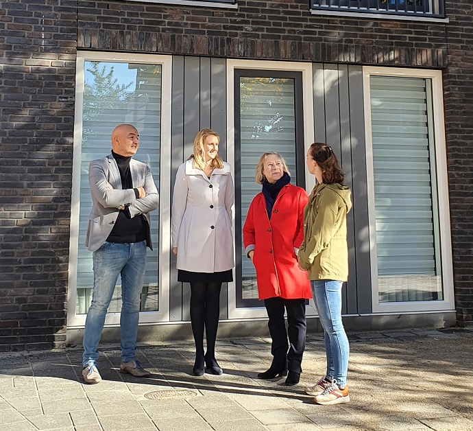 (V.l.n.r.) René Beks, Gaby van den Waardenburg en Ingrid de Boer in gesprek met bewoonster Joy Kusters