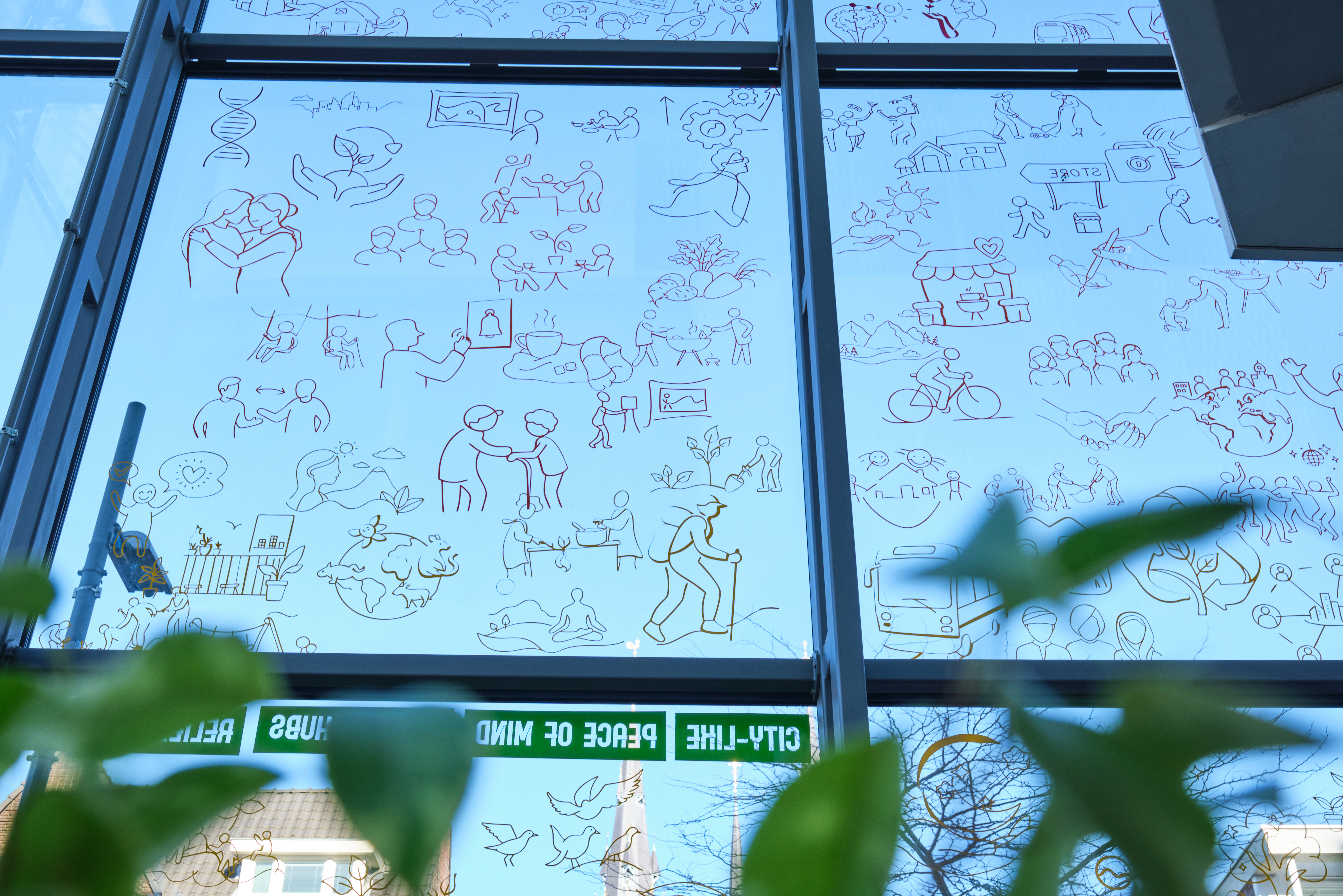 Een groot kunstwerk werd live aangebracht op de voorgevel van Woonbedrijf met behulp van raamstickers. Deze stickers werden gemaakt met behulp van AI (kunstmatige intelligentie) en zijn geïnspireerd door input die we verzamelden via straatgesprekken met bewoners, partners en bezoekers van DDW.