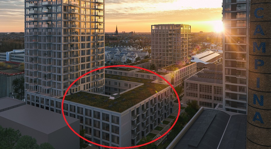 In de rode cirkel zie je het gebouw met de 71 huurappartementen en studio's. Het gebouw heeft 4 woonlagen met lift.